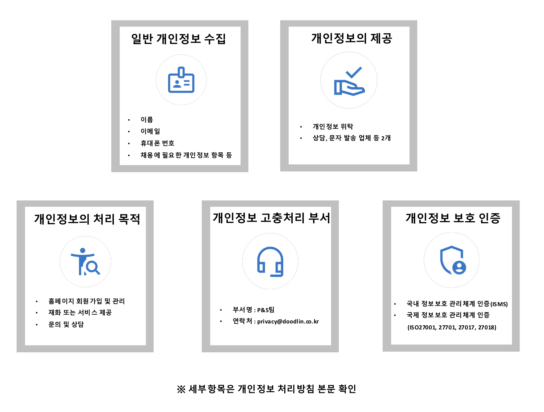 주식회사 두들린(이하 ‘회사’)은 개인정보보호법 제30조에 따라 정보주체의 개인정보 보호 및 권익을 보호하고 개인정보와 관련한정보주체의 고충을 원활하게 처리할 수 있도록 다음과 같이 개인정보 처리방침을 수립 공개합니다.