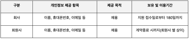 회원의 가입의사 확인, 채용 관련 안내, 공지사항 전달, 채용 및 웹사이트 이용 관련 연락을 목적으로 개인정보를 처리합니다.